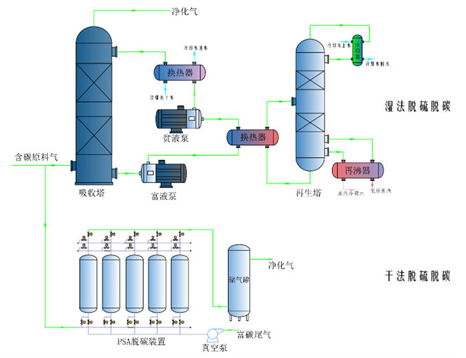 天然氣、合成氣、煉廠氣、煤氣以及窯爐煙氣等中含有硫化氫(H2S)、二氧化硫(SO2)、二氧化碳(CO2)等酸性氣體,需要脫除,方可使用。公司采用軟件模擬和工程實踐相結合,對濕法脫硫工藝、塔器結構、再生溫度等工藝做了大量的優化改進,取得了良好的效果。干法脫硫脫碳工藝采用實驗室測試和工程實踐結合,使用軟件模擬氣流分布,優化氣流分布,減小死空間,大大提高了脫除效率,延長了吸附劑壽命,可以滿足不同用戶工況條件下的脫硫脫碳要求。
